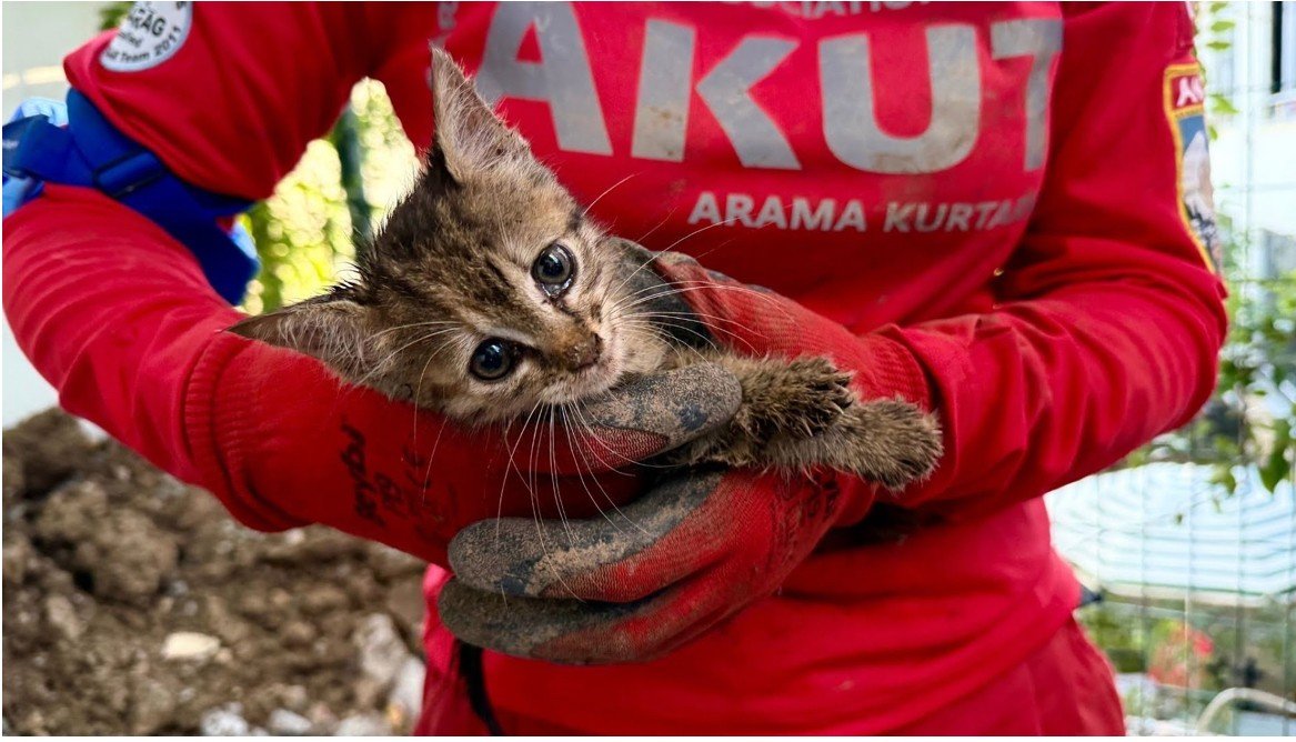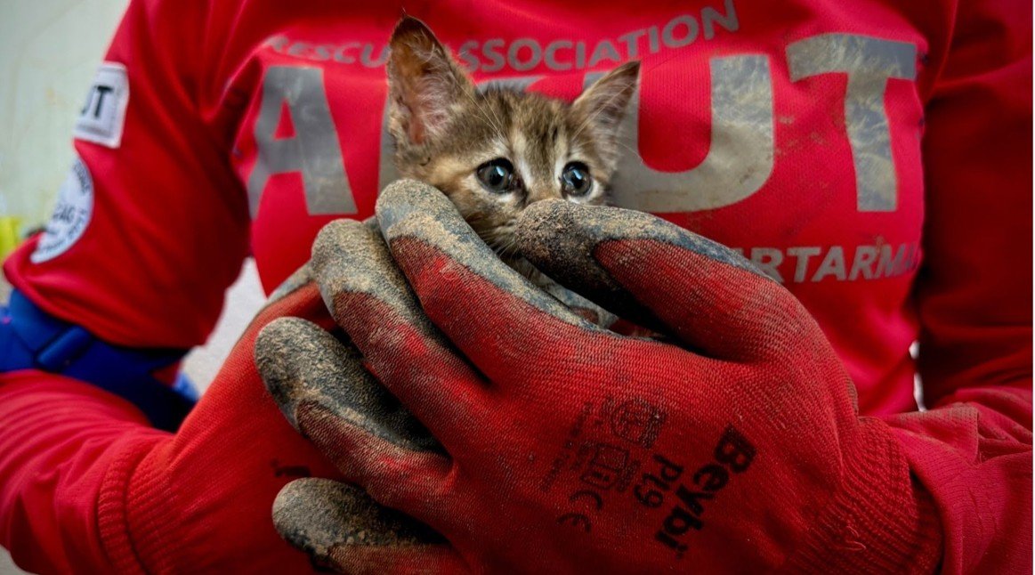“7 gündür drenaj borusunda mahsur kalan bir yavru kedi için çağrı aldık. 6 arkadaşımızla bölgeye geldik. Vatandaşlar çok uğraşmış ama sonuç alınamamış. Biz elimizden geleni yaparak 2,5 metre aşağıya indik ve kedimizi sağ salim çıkardık. Görevimiz bu, ne mutlu bize.”