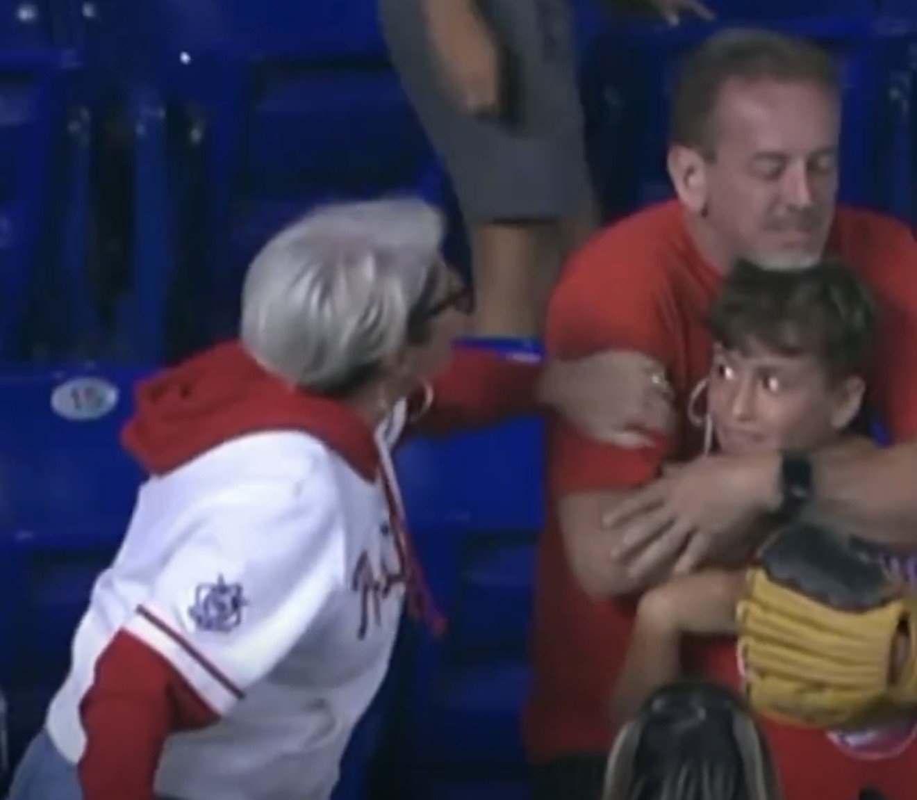 Ama işte tam da bu noktada “olayın yıldızı” sahneye çıktı: Tribünde oturan bir kadın hızla ikiliye doğru yöneldi. Görüntülerde, kadının adamın koluna dokunduğu ve sert bir şekilde konuştuğu görülüyor. Adam önce şaşkın, sonra huzursuz bir tavırla çocuğun eldiveninden topu çıkarıyor ve kadına uzatıyor. Kadın, istediğini elde etmiş olmanın rahatlığıyla tribünden uzaklaşıyor.