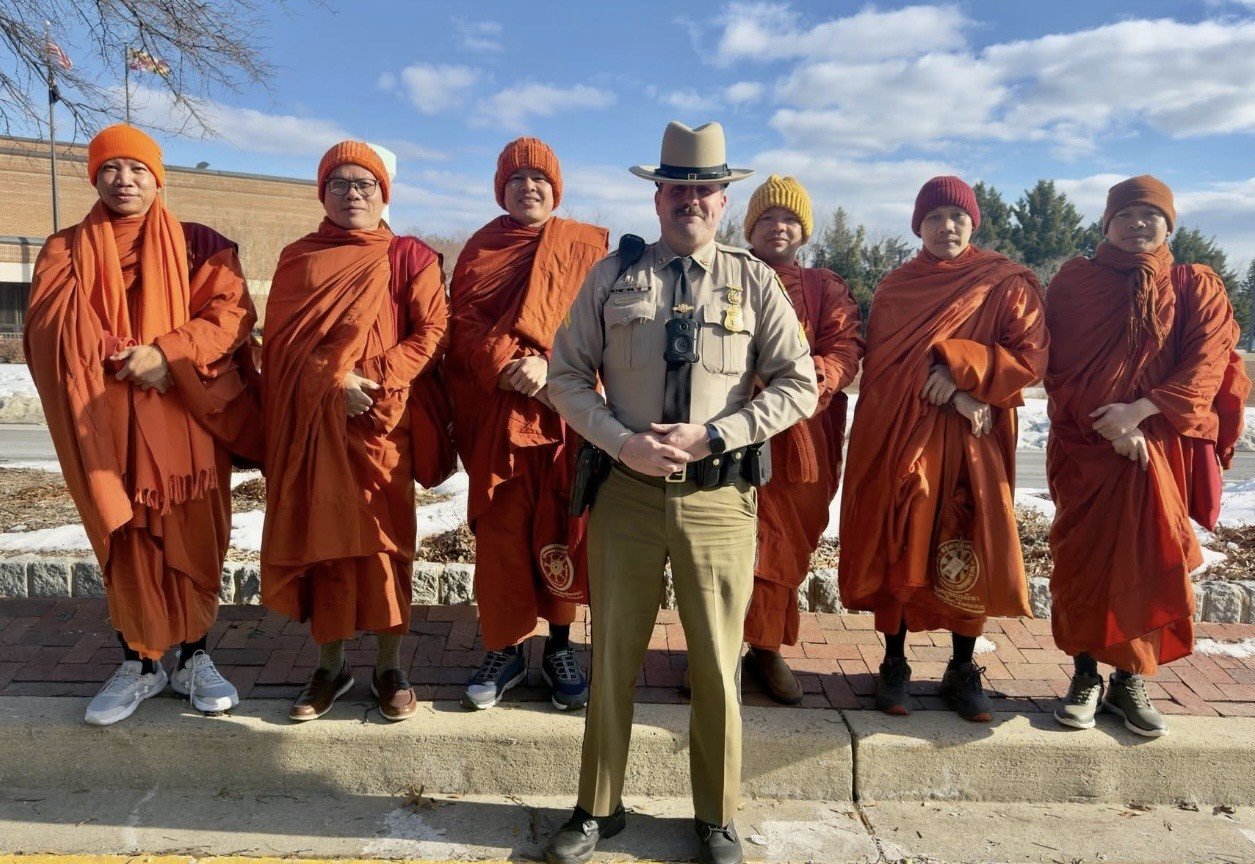 Keşişler, 26 Ekim 2025’te Teksas’ın Fort Worth kentindeki Huong Dao Vipassana Bhavana Merkezi’nden tek sıra halinde, sessiz ve mindful bir yürüyüşle yola çıktı. Dokuz eyaleti kapsayan rotada zorlu hava koşulları, kar fırtınaları ve hatta bir keşişin trafik kazasında bacağını kaybetmesi gibi zorluklara rağmen kararlılıkla devam ettiler. Yanlarında Hindistan’dan kurtarılmış bir sokak köpeği olan Aloka da onlara eşlik etti.