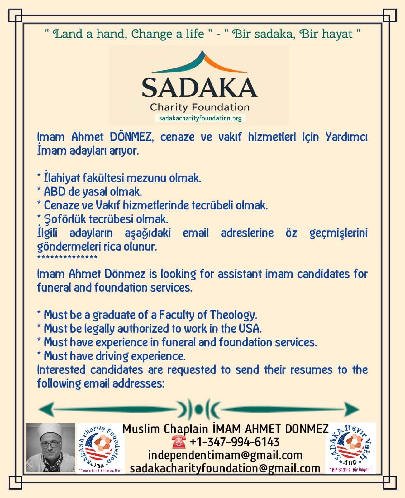 NEW YORK – Amerika Birleşik Devletleri’nde cenaze ve vakıf hizmetleri yürüten İmam Ahmet Dönmez, topluma daha etkili ve kapsamlı hizmet sunabilmek için yeni imam adaylarına ihtiyaç duyulduğunu açıkladı. Dönmez, özellikle cenaze işlemleri ve vakıf hizmetlerinde deneyimli kadroların önemine dikkat çekti.