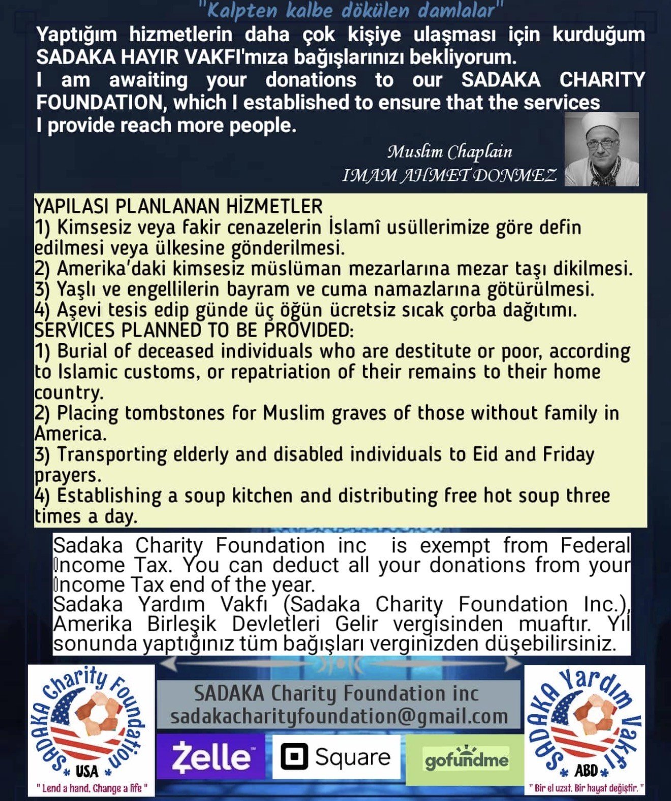 “Sadaka Charity Foundation Inc., Amerika Birleşik Devletleri federal gelir vergisinden muaftır. Yıl sonunda yaptığınız tüm bağışlar vergiden düşülebilir.”